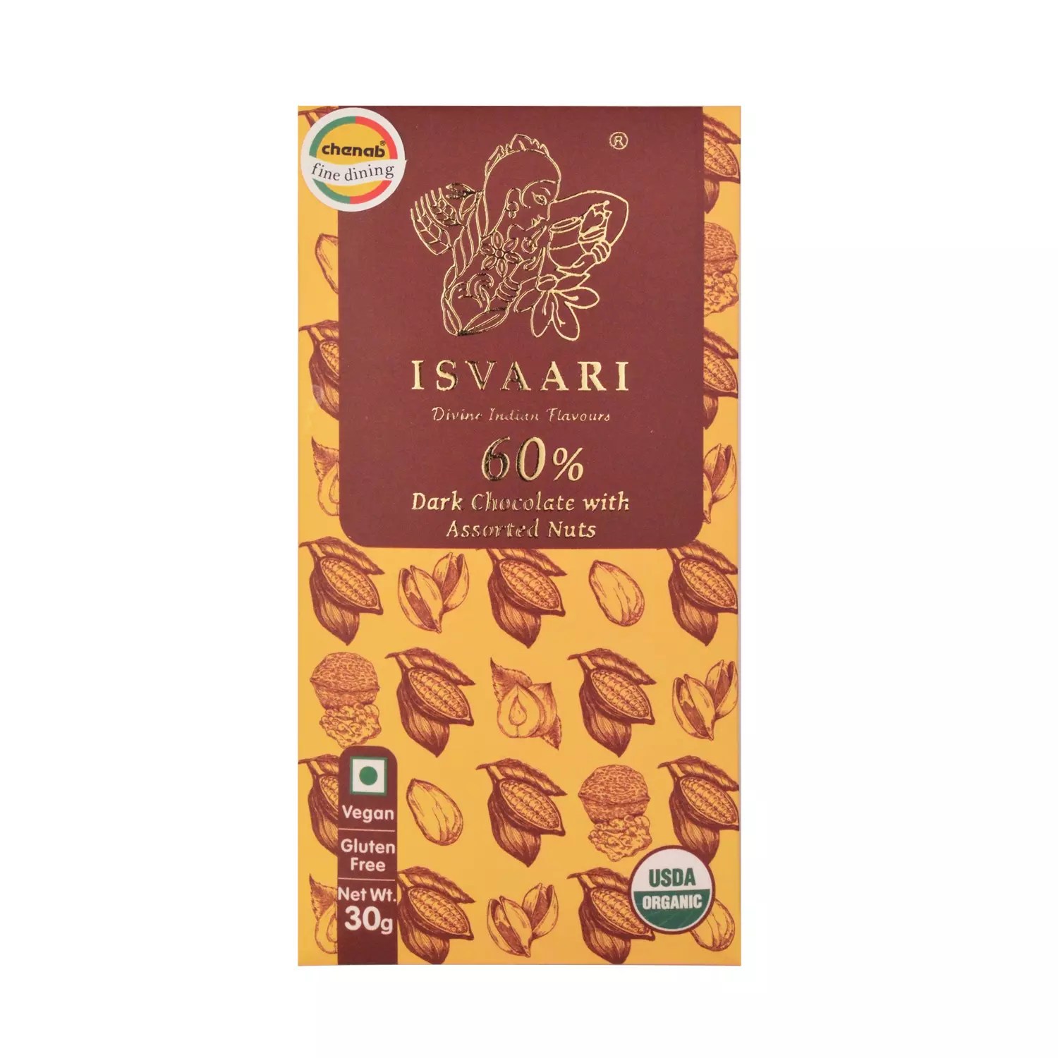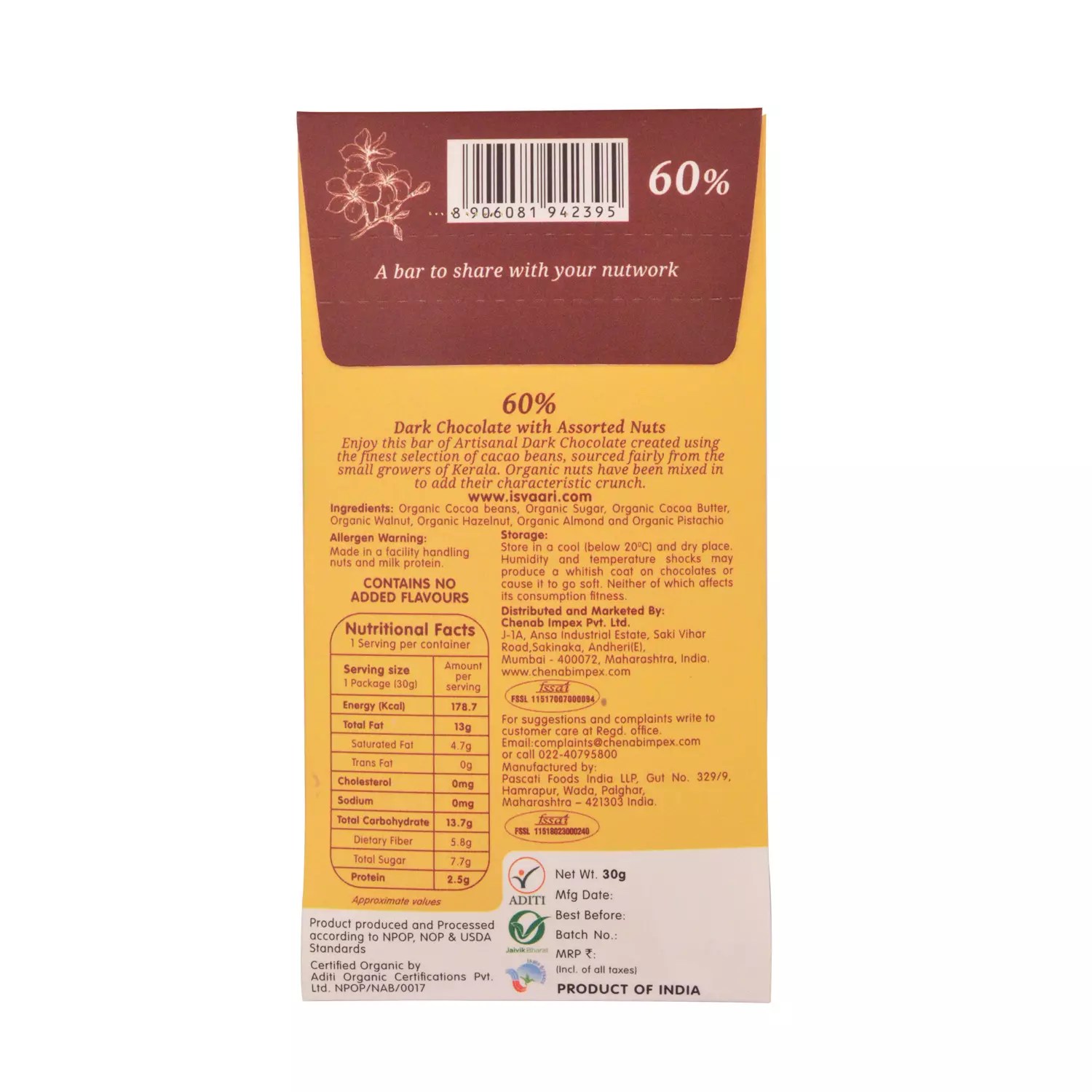 Enjoy this bar of Artisanal Dark Chocolate created using the finest selection of cacao beans, sourced fairly from the small growers of Kerala. Organic nuts have been mixed in to add their characteristic crunch.